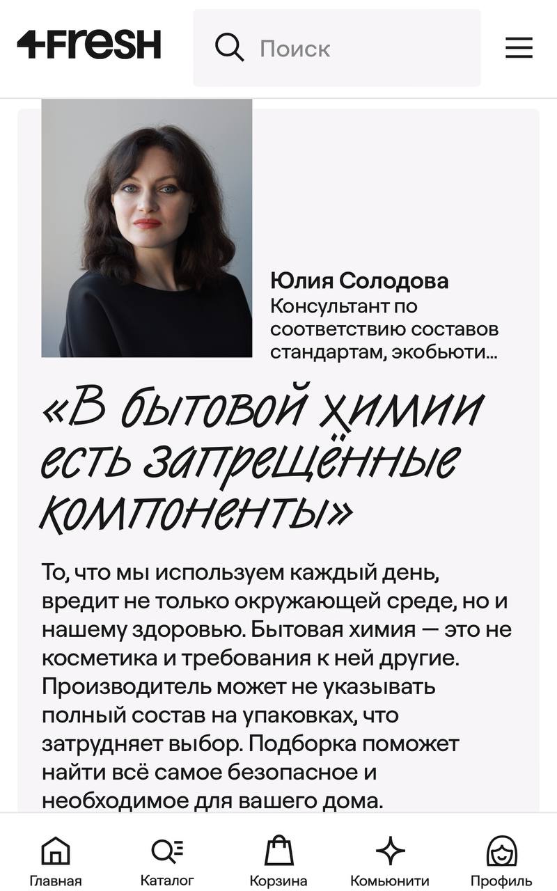 Вы, возможно, знаете, что 4фреш обновил своё позиционирование, сайт и мобильное приложение. Ещё из обновлений - теперь на главной странице можно найти подборки от разных экспертов. Я подготовила для вас по бытовой химии и добавила несколько позиций, относящихся к экодому: https://4fresh.ru/collection/osoznannyy-ekodom.